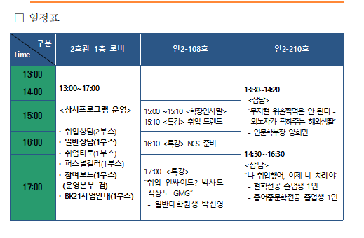 13:00 | 13:00~17:00 <상시프로그램 운영> · 취업상담(2부스) · 일반상담(1부스) · 취업타로(1부스) · 퍼스널컬러(1부스) · 참여보드(1부스) (운영본부 겸) · BK21사업안내(1부스) | 13:30~14:20 <잡담> "무지컬 워홀찍먹은 안 된다 - 외노자가 픽해주는 해외생활“ - 인문학부장 양희민 14:30~16:30 <잡담> “나 취업했어, 이제 네 차례야” - 철학전공 졸업생 1인 - 중어중문학전공 졸업생 1인 | |